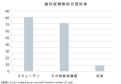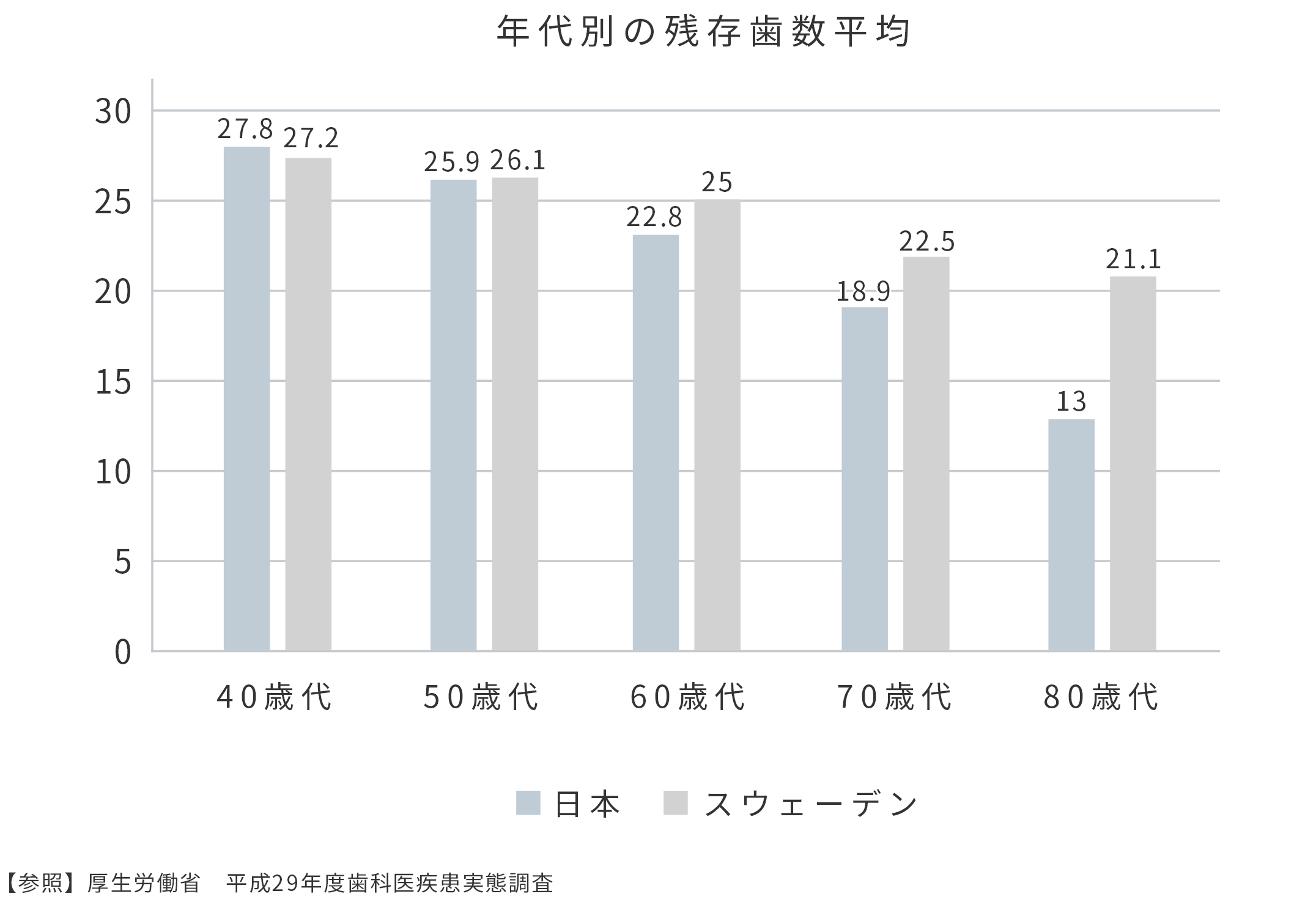 左のグラフは80歳時において残っている歯の本数の平均値ですが、他の国とは明らかな大差があります。同じ先進国のスウェーデンでは、ほとんど入れ歯の方はいないそうです。しかし日本ではどうでしょうか?1989年から厚生省(現・厚生労働省)と日本歯科医師会が推進している 「8020運動」は、80歳の時点で20本以上の自分の歯を保つことを目的としたプロジェクトです。平均値において日本ではまだまだ達成に至る難しいのが現状です。なぜ、他国に比べてそのような現状があるのでしょうか?